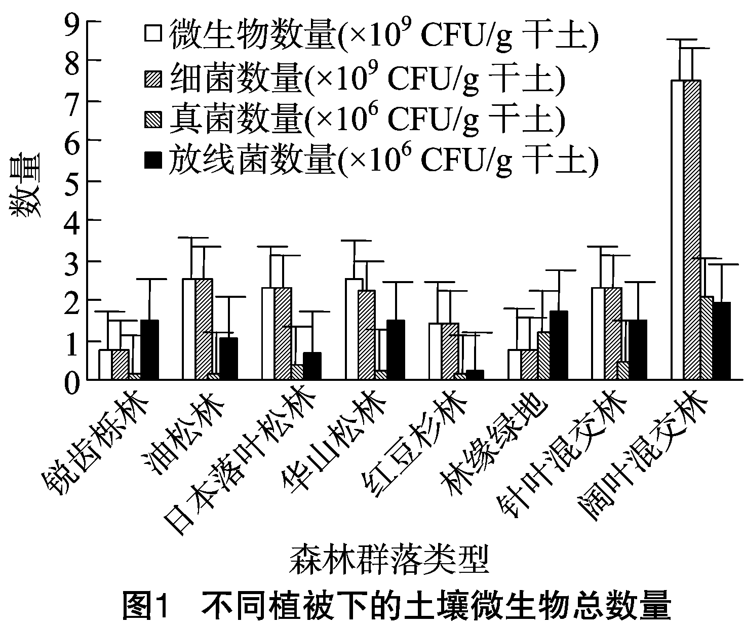 日本落叶松人工林下的土壤微生物数量多于锐齿栎林、红豆杉林;锐齿栎林、阔叶混交林、针叶混交林、林缘草地中的土壤微生物数量由多到少依次为:阔叶混交林>针叶混交林>锐齿栎林>林缘草地,即混合林的微生物数量大于纯林地微生物数量,此结果与王健等[15]、齐雅静等[16]的研究结果相同。这主要是因为不同树种、植被其凋落物的种类、数量不同,导致其土壤养分含量、水分、温度等不同,进而影响了土壤微生物的种类、数量[17-20]。小陇山国家级自然保护区内森林覆盖率高,物种组成丰富。