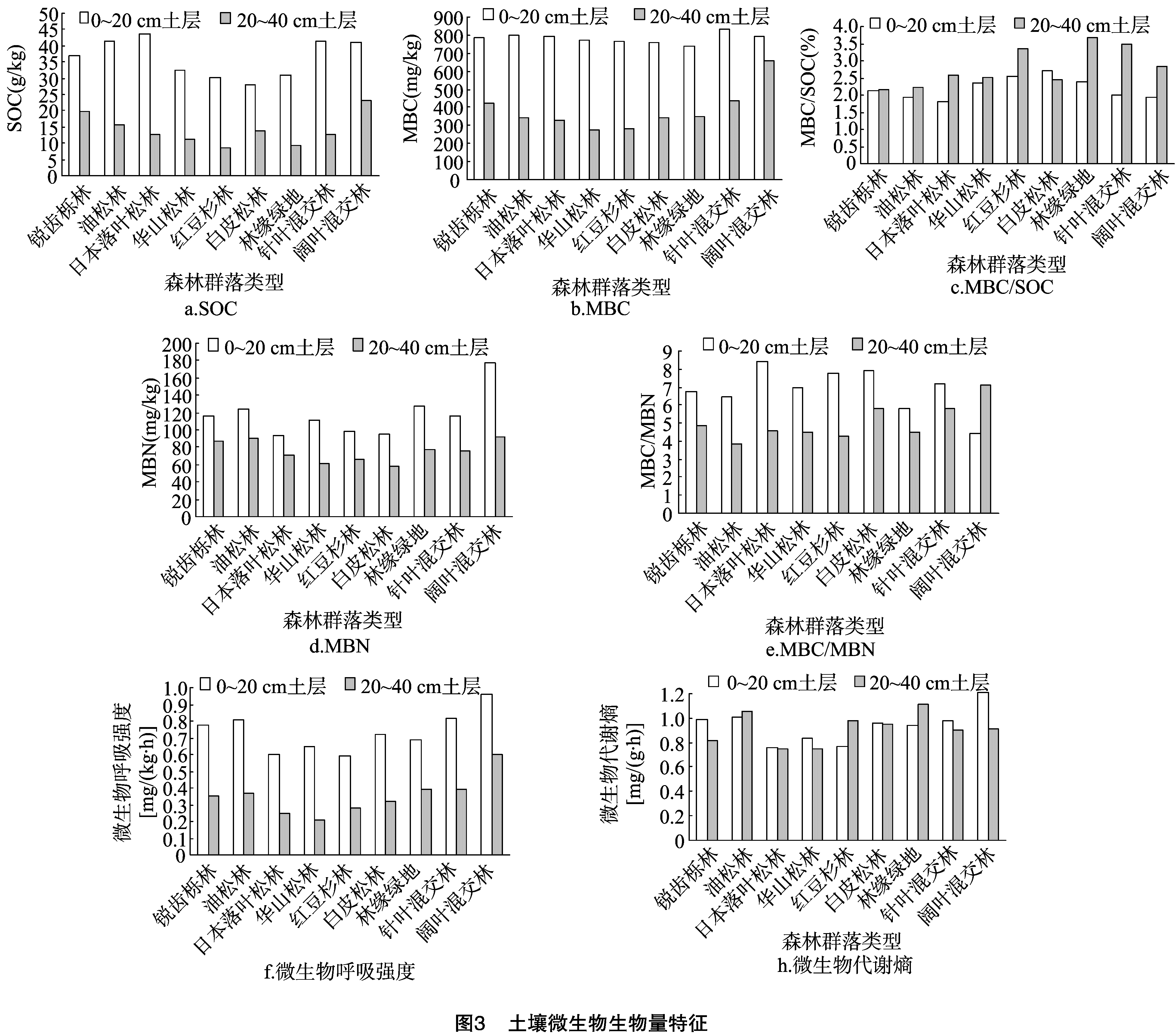 如图3所示:红豆杉林各样地中表层有机碳(SOC)含量明显高于下层;各样地中的微生物生物量碳(MBC)含量大于非洲热带森林(280~480 mg/kg),略高于该气候带的橡胶树(380.80~568.3 mg/kg),但小于温带森林(1 080 mg/kg)。随着土层的加深,MBC值迅速下降。随着土层的加深,MBC/SOC值也随着增大,这说明深层土壤碳积累强度大于表层土壤,土壤有机碳逐渐由土壤表层向土壤深层转移;随着土层的加深,MBN值下降,土壤微生物呼吸强度降低。温带土壤微生物代谢熵(qCO2)这一数值范围大致在1~7 mg/(g·h)之间,本试验值偏低,究其原因可能与研究区域的植被类型、温度、水分等生境因素有关,另外还要考虑不同土壤呼吸的测量方法对数据的影响。