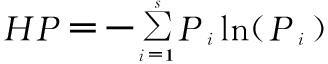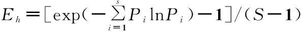 式中:Pi是第i种个体数ni占总个体数N的比例,即Pi=ni/N;S为物种数目;N为所有物种的总个体数;ni是第i种物种的个体数。