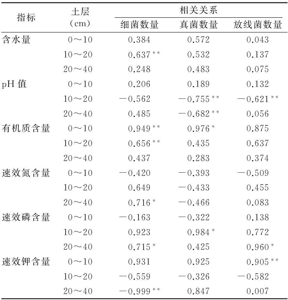 表2 土壤微生物数量与土壤因子的相关性