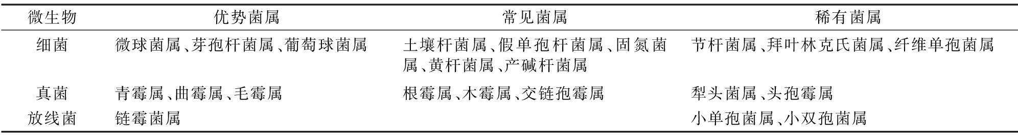 微生物优势菌属常见菌属稀有菌属细菌微球菌属、芽孢杆菌属、葡萄球菌属土壤杆菌属、假单孢杆菌属、固氮菌属、黄杆菌属、产碱杆菌属节杆菌属、拜叶林克氏菌属、纤维单孢菌属真菌青霉属、曲霉属、毛霉属根霉属、木霉属、交链孢霉属犁头菌属、头孢霉属放线菌链霉菌属小单孢菌属、小双孢菌属