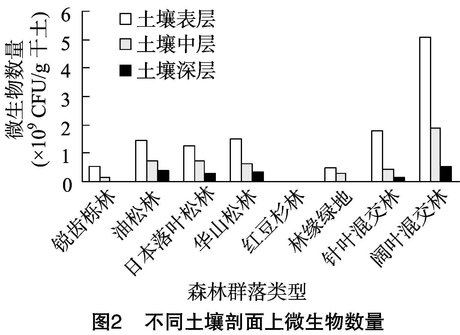 3.1.1 数量特征 土壤微生物数量直接影响土壤生物化学活性及土壤养分的组成与转化,是林地土壤肥力的重要指标,其数量与分布不但反映了各因素对微生物的影响,同时也反映了微生物对植物生长发育、土壤肥力的影响。研究表明,土壤微生物能较早地预测土壤质量变化,是土壤质量变化最敏感的指标[10-12]。森林土壤微生物数量常作为土壤微生物活性的重要指标之一,土壤微生物的数量、种类受土壤条件如土壤温度、湿度、pH值等的影响[13]。有学者对美国科罗拉多流域山区森林土壤中细菌、古细菌的群落组成、多样性进行研究发现,土壤微生物生物量随土壤深度增加呈指数下降;0~10 cm 土壤剖面中细菌多样性最高;从土壤表层到深层,细菌多样性下降了20%~40%,说明土壤深度对细菌群落组成具有显著影响。研究人员对土著马尾松林、外来桉树林下土壤微生物群落结构、代谢活动进行研究发现,桉树林下土壤中细菌的数量、生物量、碳代谢活动、微生物群落多样性明显低于马尾松林。