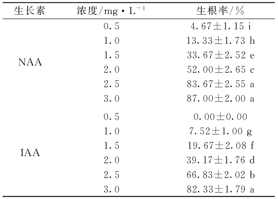 生长素浓度/mg·L-1生根率/%NAA0.54.67±1.15i1.013.33±1.73h1.533.67±2.52e2.052.00±2.65c2.583.67±2.55a3.087.00±2.00aIAA0.50.00±0.001.07.52±1.00g1.519.67±2.08f2.039.17±1.76d2.566.83±2.02b3.082.33±1.79a