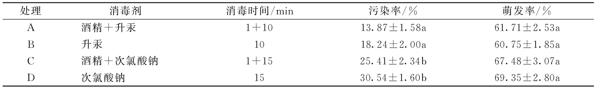 处理消毒剂消毒时间/min污染率/%萌发率/%A酒精+升汞1+1013.87±1.58a61.71±2.53aB升汞1018.24±2.00a60.75±1.85aC酒精+次氯酸钠1+1525.41±2.34b67.48±3.07aD次氯酸钠1530.54±1.60b69.35±2.80a