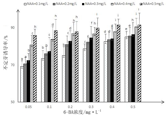 图1 不同浓度6-BA和NAA组合不定芽诱导率
