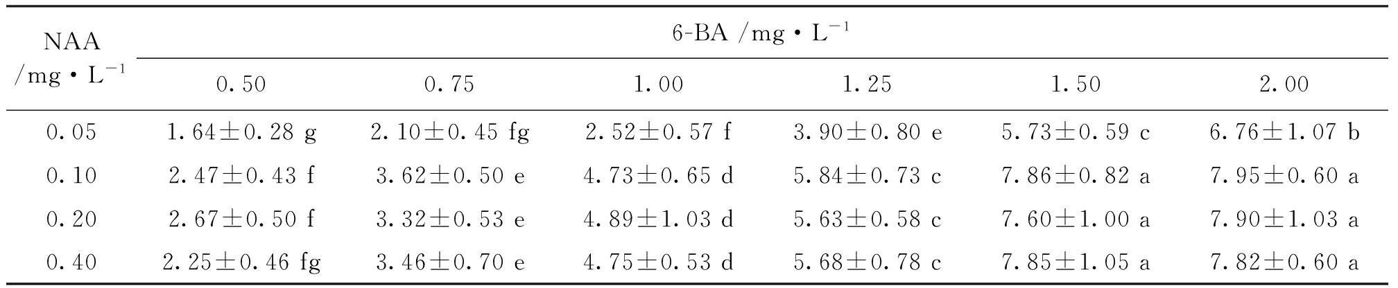 NAA/mg·L-16-BA/mg·L-10.500.751.001.251.502.000.051.64±0.28g2.10±0.45fg2.52±0.57f3.90±0.80e5.73±0.59c6.76±1.07b0.102.47±0.43f3.62±0.50e4.73±0.65d5.84±0.73c7.86±0.82a7.95±0.60a0.202.67±0.50f3.32±0.53e4.89±1.03d5.63±0.58c7.60±1.00a7.90±1.03a0.402.25±0.46fg3.46±0.70e4.75±0.53d5.68±0.78c7.85±1.05a7.82±0.60a