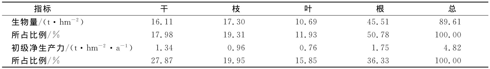 指标 干 枝 叶 根 总生物量/(t·h m-2)27.87 19.95 15.85 36.33 100.00 16.11 17.30 10.69 45.51 89.61所占比例/% 17.98 19.31 11.93 50.78 100.00初级净生产力/(t·h m-2·a-1) 1.34 0.96 0.76 1.75 4.82所占比例/%
