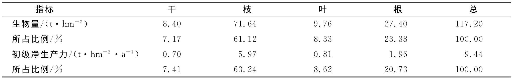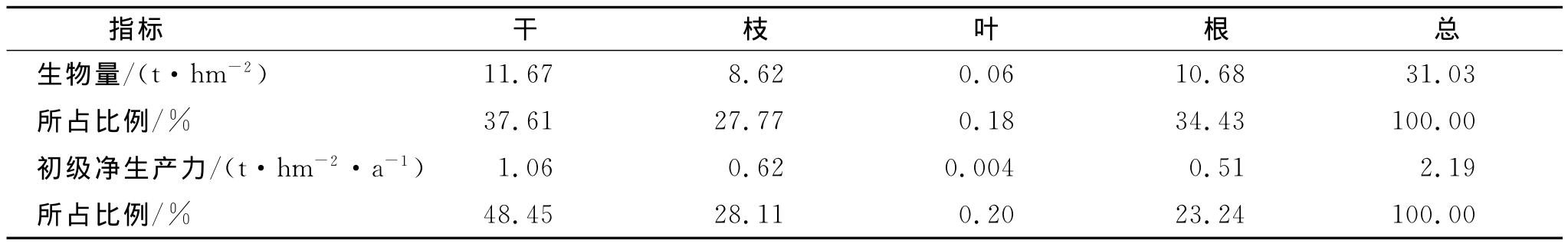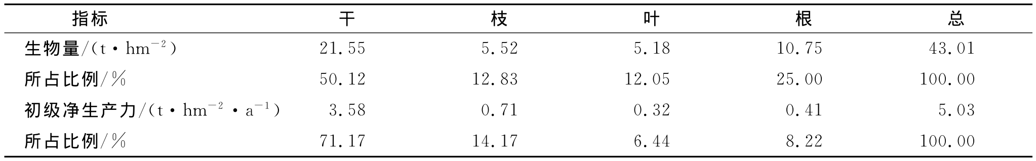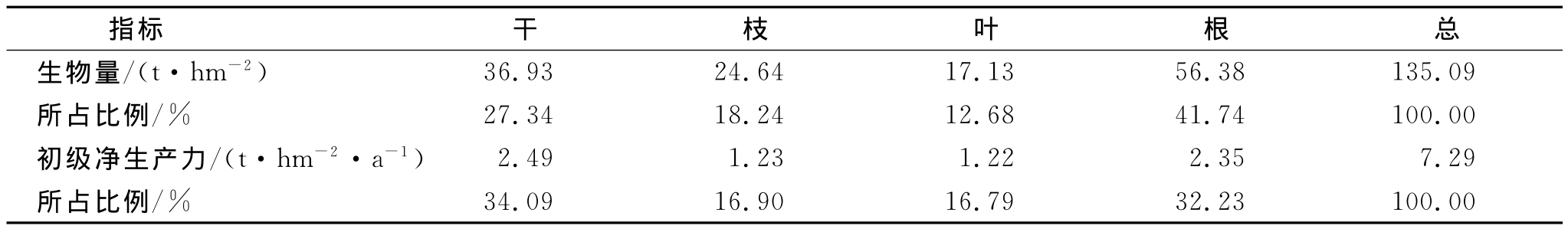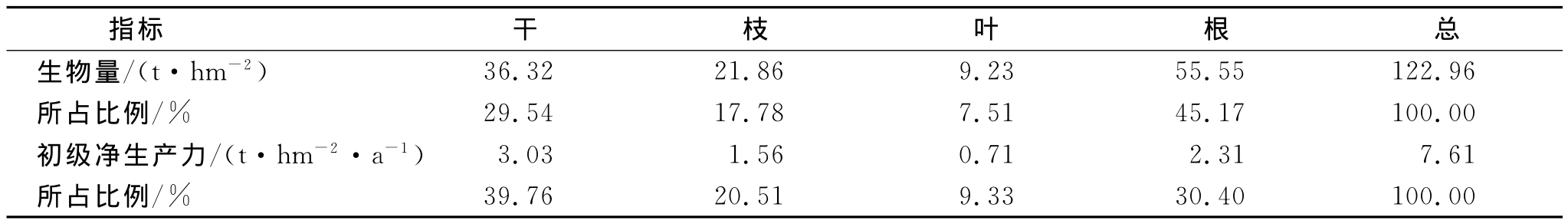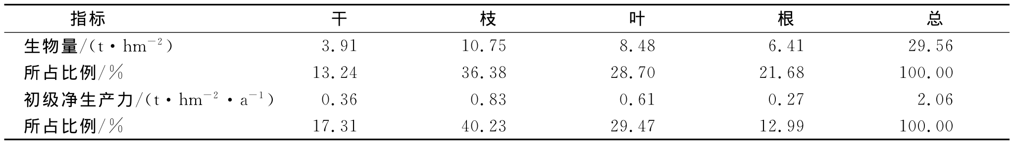 指标 干 枝 叶 根 总生物量/(t·h m-2)17.31 40.23 29.47 12.99 100.00 3.91 10.75 8.48 6.41 29.56所占比例/% 13.24 36.38 28.70 21.68 100.00初级净生产力/(t·h m-2·a-1) 0.36 0.83 0.61 0.27 2.06所占比例/%