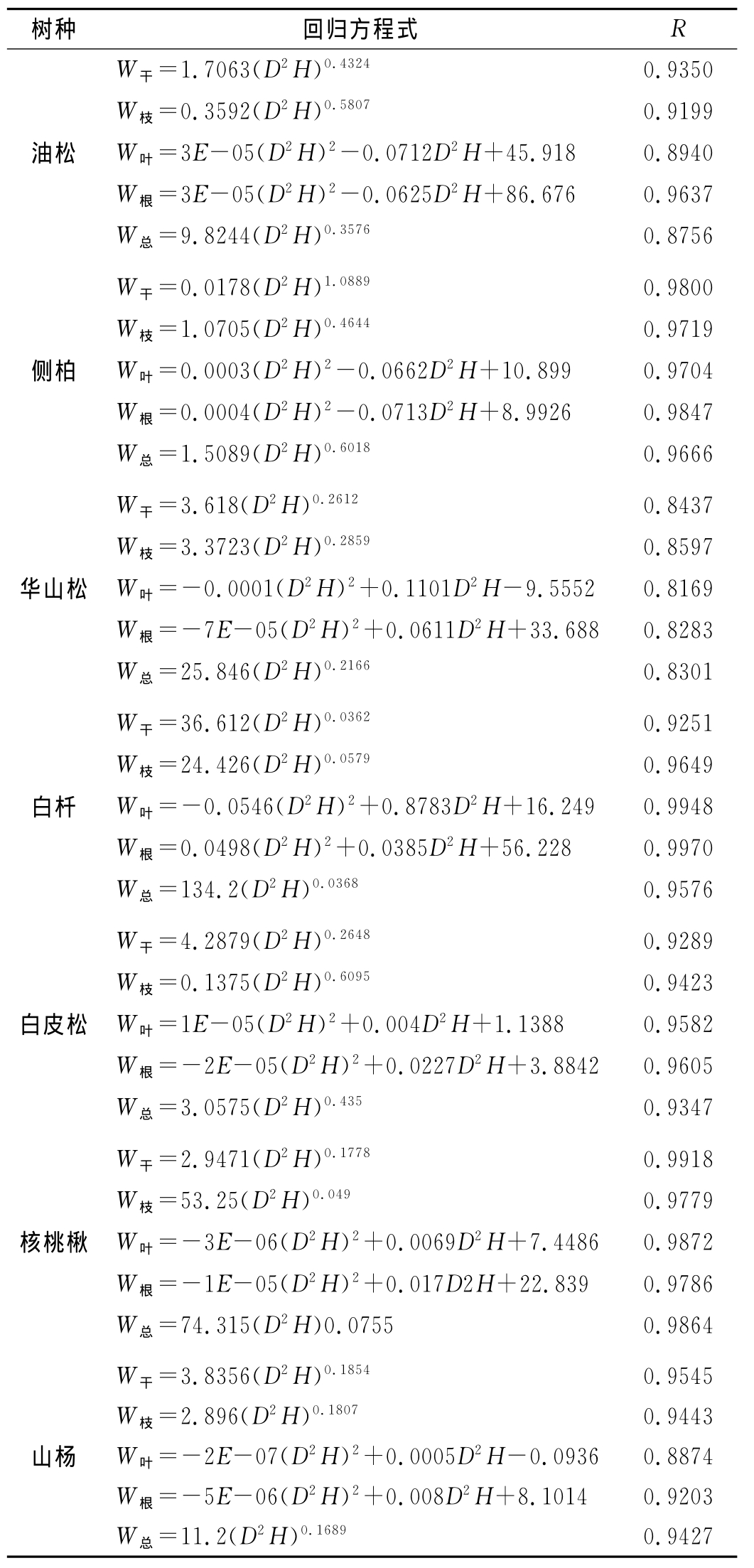 树种 回归方程式R 9350 W 枝 =0.3592(D 2 H)0.5807 0.9199油松 W叶=3E-05(D 2 H)2-0.0712 D2 H+45.918 0.8940 W根=3E-05(D 2 H)2-0.0625 D 2 H+86.676 0.9637 W 总 =9.8244(D 2 H)0.3576 0.8756 W 干 =0.0178(D 2 H)1.0889 0.9800 W 枝 =1.0705(D 2 H)0.4644 0.9719侧柏 W叶=0.0003(D 2 H)2-0.0662 D 2 H+10.899 0.9704 W根=0.0004(D 2 H)2-0.0713 D2 H+8.9926 0.9847 W 总 =1.5089(D 2 H)0.6018 0.9666 W 干 =3.618(D2 H)0.2612 0.8437 W 枝 =3.3723(D 2 H)0.2859 0.8597华山松 W叶=-0.0001(D 2 H)2+0.1101 D2 H-9.5552 0.8169 W根=-7E-05(D 2 H)2+0.0611 D 2 H+33.688 0.8283 W 总 =25.846(D 2 H)0.2166 0.8301 W 干 =36.612(D 2 H)0.0362 0.9251 W 枝 =24.426(D 2 H)0.0579 0.9649白杄 W叶=-0.0546(D 2 H)2+0.8783 D 2 H+16.249 0.9948 W根=0.0498(D 2 H)2+0.0385 D2 H+56.228 0.9970 W 总 =134.2(D 2 H)0.0368 0.9576 W 干 =4.2879(D 2 H)0.2648 0.9289 W 枝 =0.1375(D 2 H)0.6095 0.9423白皮松 W叶=1E-05(D 2 H)2+0.004 D 2 H+1.1388 0.9582 W根=-2E-05(D 2 H)2+0.0227 D 2 H+3.8842 0.9605 W 总 =3.0575(D 2 H)0.435 0.9347 W 干 =2.9471(D 2 H)0.1778 0.9918 W 枝 =53.25(D2 H)0.049 0.9779核桃楸 W叶=-3E-06(D 2 H)2+0.0069 D 2 H+7.4486 0.9872 W根=-1E-05(D 2 H)2+0.017 D2 H+22.839 0.9786 W 总 =74.315(D 2 H)0.0755 0.9864 W 干 =3.8356(D 2 H)0.1854 0.9545 W 枝 =2.896(D 2 H)0.1807 0.9443山杨 W叶=-2E-07(D2 H)2+0.0005 D2 H-0.0936 0.8874 W根=-5E-06(D 2 H)2+0.008 D 2 H+8.1014 0.9203 W 总 =11.2(D 2 H)0.1689 W 干 =1.7063(D 2 H)0.4324 0.0.9427