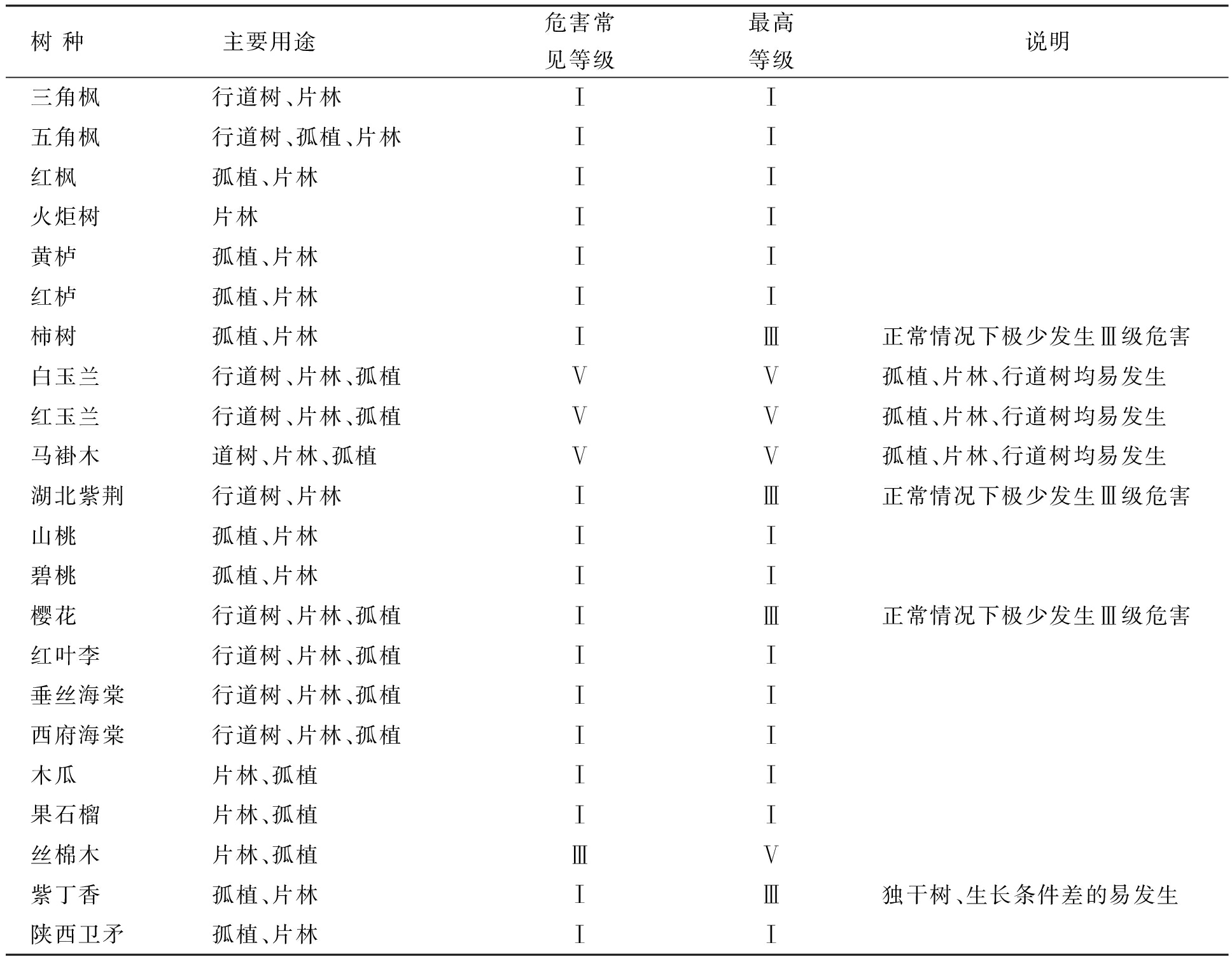 树种主要用途危害常见等级最高等级说明三角枫行道树、片林ⅠⅠ五角枫行道树、孤植、片林ⅠⅠ红枫孤植、片林ⅠⅠ火炬树片林ⅠⅠ黄栌孤植、片林ⅠⅠ红栌孤植、片林ⅠⅠ柿树孤植、片林ⅠⅢ正常情况下极少发生Ⅲ级危害白玉兰行道树、片林、孤植ⅤⅤ孤植、片林、行道树均易发生红玉兰行道树、片林、孤植ⅤⅤ孤植、片林、行道树均易发生马褂木道树、片林、孤植ⅤⅤ孤植、片林、行道树均易发生湖北紫荆行道树、片林ⅠⅢ正常情况下极少发生Ⅲ级危害山桃孤植、片林ⅠⅠ碧桃孤植、片林ⅠⅠ樱花行道树、片林、孤植ⅠⅢ正常情况下极少发生Ⅲ级危害红叶李行道树、片林、孤植ⅠⅠ垂丝海棠行道树、片林、孤植ⅠⅠ西府海棠行道树、片林、孤植ⅠⅠ木瓜片林、孤植ⅠⅠ果石榴片林、孤植ⅠⅠ丝棉木片林、孤植ⅢⅤ紫丁香孤植、片林ⅠⅢ独干树、生长条件差的易发生陕西卫矛孤植、片林ⅠⅠ