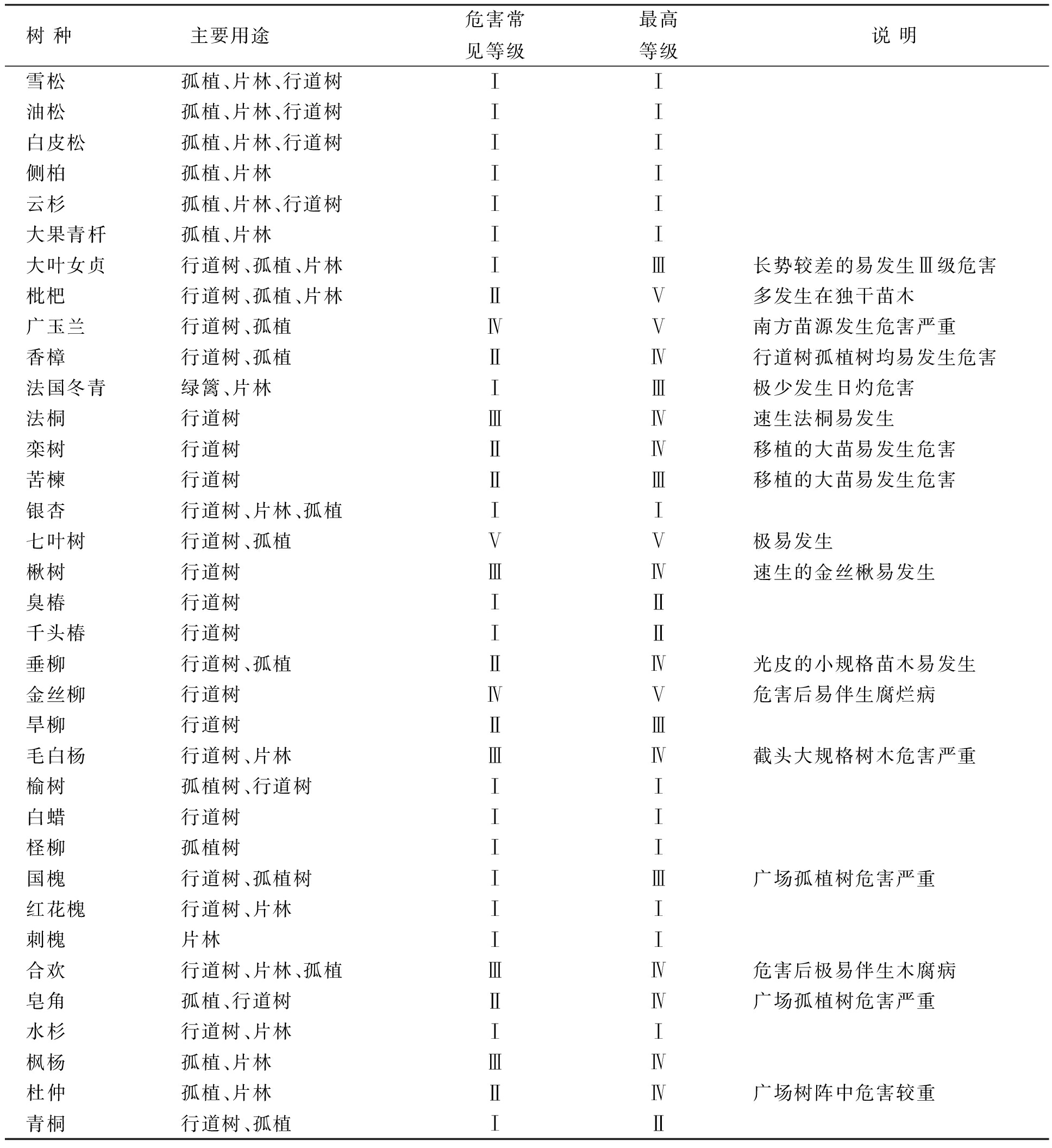 树种主要用途危害常见等级最高等级说明雪松孤植、片林、行道树ⅠⅠ油松孤植、片林、行道树ⅠⅠ白皮松孤植、片林、行道树ⅠⅠ侧柏孤植、片林ⅠⅠ云杉孤植、片林、行道树ⅠⅠ大果青杄孤植、片林ⅠⅠ大叶女贞行道树、孤植、片林ⅠⅢ长势较差的易发生Ⅲ级危害枇杷行道树、孤植、片林ⅡⅤ多发生在独干苗木广玉兰行道树、孤植ⅣⅤ南方苗源发生危害严重香樟行道树、孤植ⅡⅣ行道树孤植树均易发生危害法国冬青绿篱、片林ⅠⅢ极少发生日灼危害法桐行道树ⅢⅣ速生法桐易发生栾树行道树ⅡⅣ移植的大苗易发生危害苦楝行道树ⅡⅢ移植的大苗易发生危害银杏行道树、片林、孤植ⅠⅠ七叶树行道树、孤植ⅤⅤ极易发生楸树行道树ⅢⅣ速生的金丝楸易发生臭椿行道树ⅠⅡ千头椿行道树ⅠⅡ垂柳行道树、孤植ⅡⅣ光皮的小规格苗木易发生金丝柳行道树ⅣⅤ危害后易伴生腐烂病旱柳行道树ⅡⅢ毛白杨行道树、片林ⅢⅣ截头大规格树木危害严重榆树孤植树、行道树ⅠⅠ白蜡行道树ⅠⅠ柽柳孤植树ⅠⅠ国槐行道树、孤植树ⅠⅢ广场孤植树危害严重红花槐行道树、片林ⅠⅠ刺槐片林ⅠⅠ合欢行道树、片林、孤植ⅢⅣ危害后极易伴生木腐病皂角孤植、行道树ⅡⅣ广场孤植树危害严重水杉行道树、片林ⅠⅠ枫杨孤植、片林ⅢⅣ杜仲孤植、片林ⅡⅣ广场树阵中危害较重青桐行道树、孤植ⅠⅡ