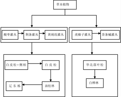 根据TWINSPAN 和DCA 分析,以及植物群落所处的环境,海拔、地形、土壤等,将群落演替分为两个独立的演替序列,得出五鹿山植物群落演替序列如下:酸枣灌丛→荆条灌丛→黄刺玫灌丛→白皮松+侧柏林→白皮松林→油松林→辽东栎林;虎榛子灌丛→茶条槭灌丛→华北落叶松林→白桦林。此演替系列可以被看作五鹿山植物群落演替的一个模型(图五),可以为以后五鹿山植物群落的研究提供一定的依据。尽管生态环境有所不同,但这个模型还是与其他地方的模型具有相似性。其中,刺槐林和侧柏林均为人工栽培的纯林,在自然演替序列中可以不考虑。