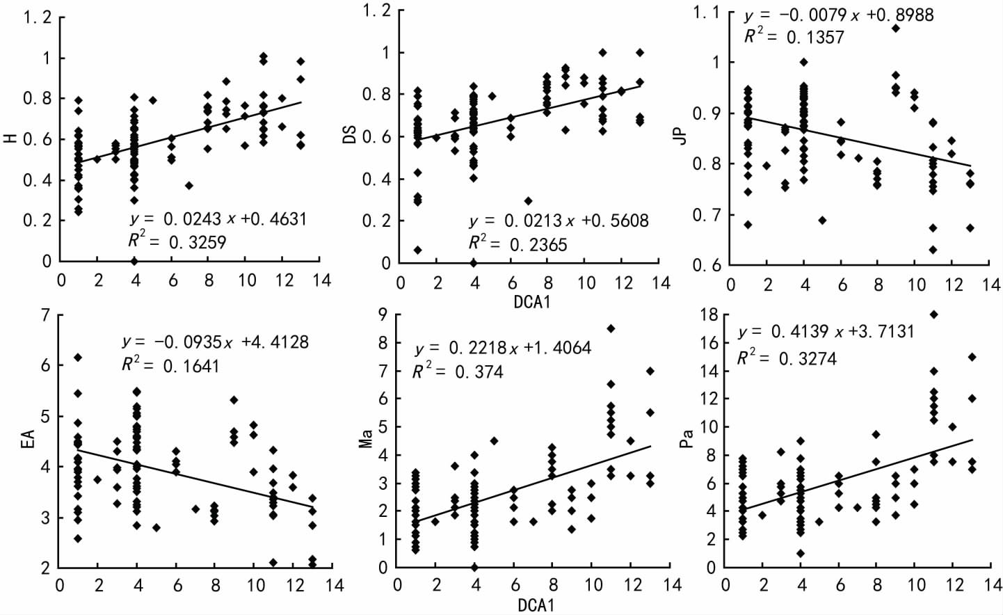 使用文中所提到的6个指数来计算每个样方中种的异质性、丰富度、均匀度。横轴,DCA1 为演替梯度。纵轴为多样性指数的值,表示物种多样性变化(图4)。