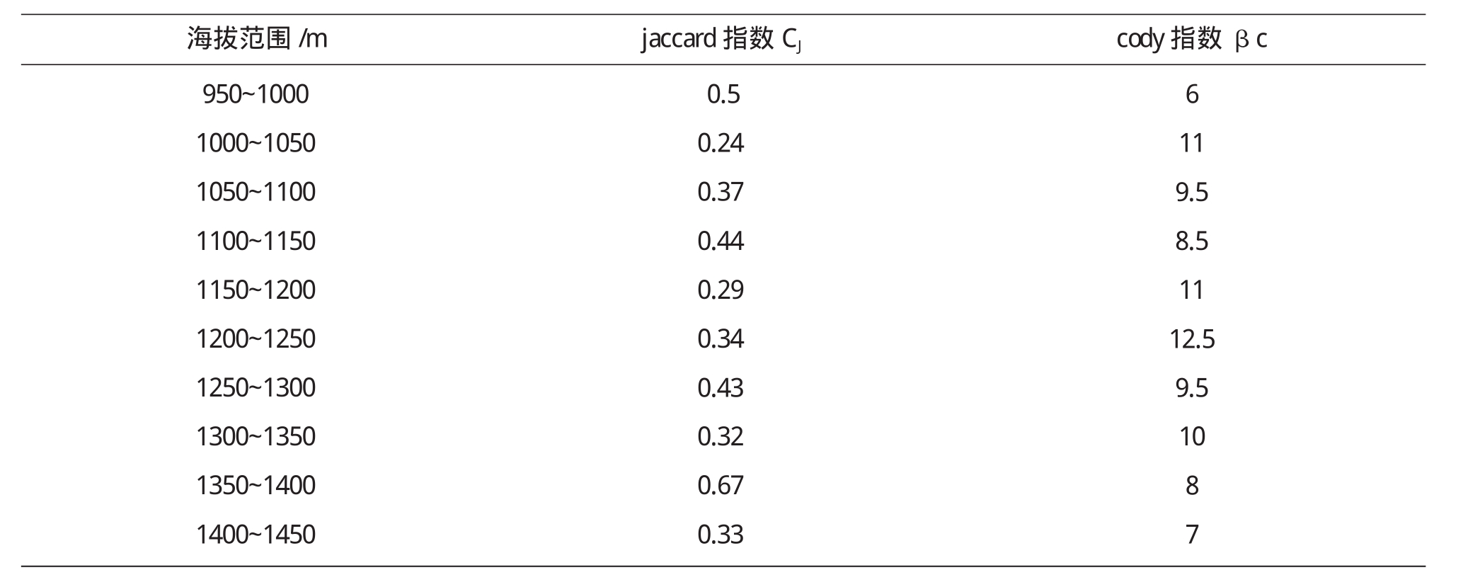 海拔范围/m jaccard指数CJ cody指数βc 950~10001000~10501050~11001100~11501150~12001200~12501250~13001300~13501350~14001400~14500.50.240.370.440.290.340.430.320.670.336119.58.51112.59.51087