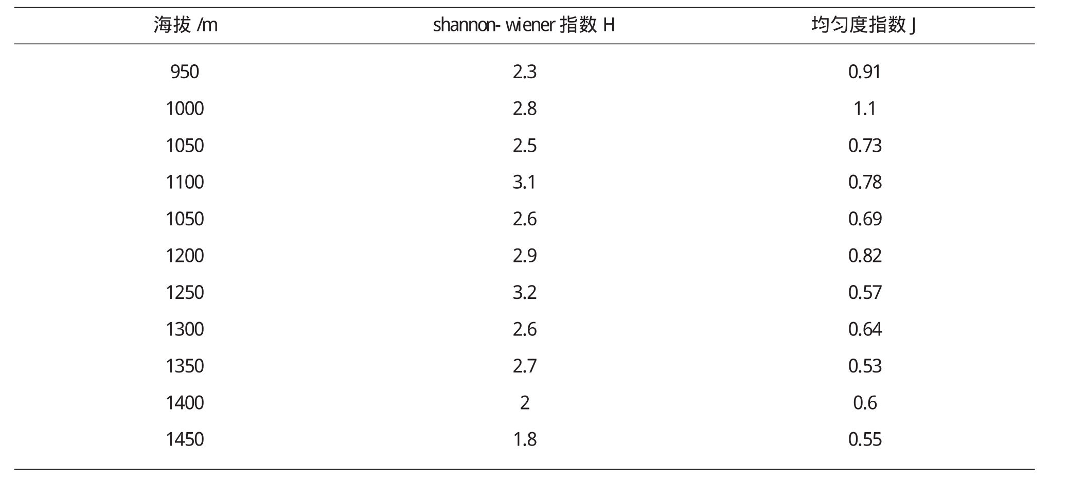 海拔/m shannon-wiener指数H均匀度指数J 95010001050110010501200125013001350140014502.32.82.53.12.62.93.22.62.721.80.911.10.730.780.690.820.570.640.530.60.55