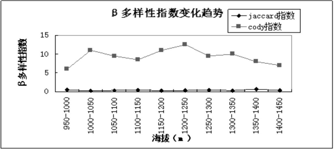 β多样性指沿环境梯度不同生境群落之间物种组成的相异性或物种沿环境梯度的更替速率,即生境间的多样性.一般β多样性随海拔的升高而有所降低,在低海拔处较高,主要原因与干扰及物种之间相互竞争有关.本文是通过Jaccard指数、cody指数来分析β多样性的.Jaccard指数反映群落间物种组成的相似性;Cody指数则反映群落物种组成沿环境梯度的替代速率.