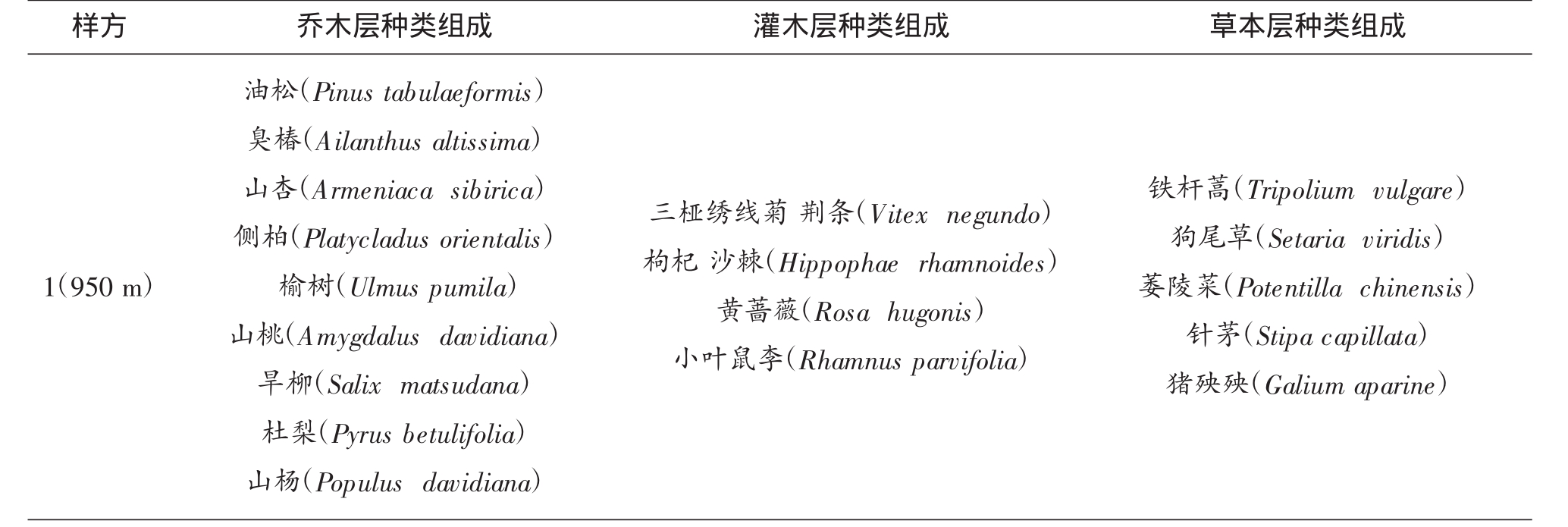 样方 乔木层种类组成 灌木层种类组成 草本层种类组成1(950m)油松(Pinus tabulaeformis)臭椿(Ailanthus altissima)山杏(Armeniaca sibirica)侧柏(Platycladus orientalis)榆树(Ulmus pumila)山桃(Amygdalus davidiana)旱柳(Salix matsudana)杜梨(Pyrus betulifolia)山杨(Populus davidiana)三桠绣线菊荆条(Vitex negundo)枸杞 沙棘(Hippophae rhamnoides)黄蔷薇(Rosa hugonis)小叶鼠李(Rhamnus parvifolia)铁杆蒿(Tripolium vulgare)狗尾草(Setaria viridis)萎陵菜(Potentilla chinensis)针茅(Stipa capillata)猪殃殃(Galium aparine)