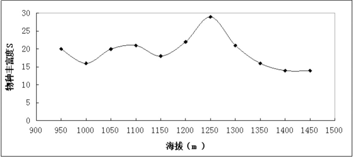 物种丰富度(species richness)随海拔梯度的变化格局一般有两种:物种丰富度随海拔升高而递减和中海拔地区最丰富.乌金山植物物种丰富度属于在中海拔地区较丰富,中海拔地区降水和温度条件适宜大多数物种的生存,中海拔地区生境较均匀,出现较多种类的草本与灌木,致使植物群落的多样性增加.