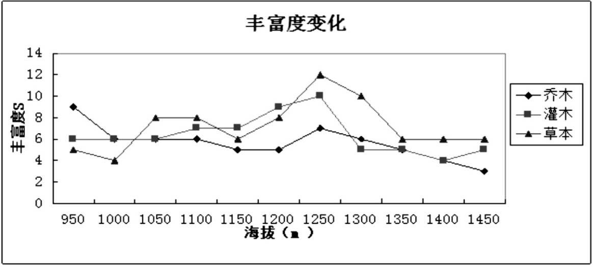 由于不同生活型的植物存在不同的多样性分布格局,本文对乔灌草的丰富度也做了调查,如图2所示,乔木物种数在低海拔地区丰富度较高,随着海拔的升高出现下降趋势,而灌木物种数先增加后减少,因此出现木本植物的物种多样性随着海拔高度的增加而下降.而草本植物随海拔的升高先增加后减少,在中海拔出现较多的草本植物,这与中海拔地区的降水、生境比较均匀,适宜多种物种生存有关.由图2可以看出,乌金山植物群落物种多样性对海拔的敏感性由大到小的次序依次为草本层、灌木层、乔木层.