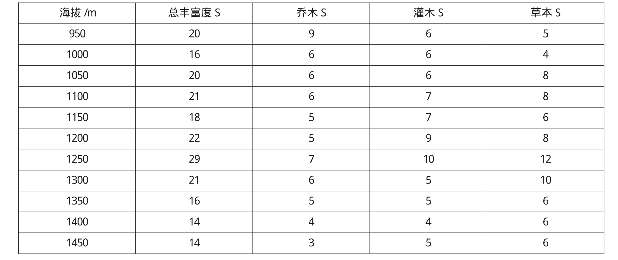 表2 乌金山植物群落物种丰富度随海拔的变化