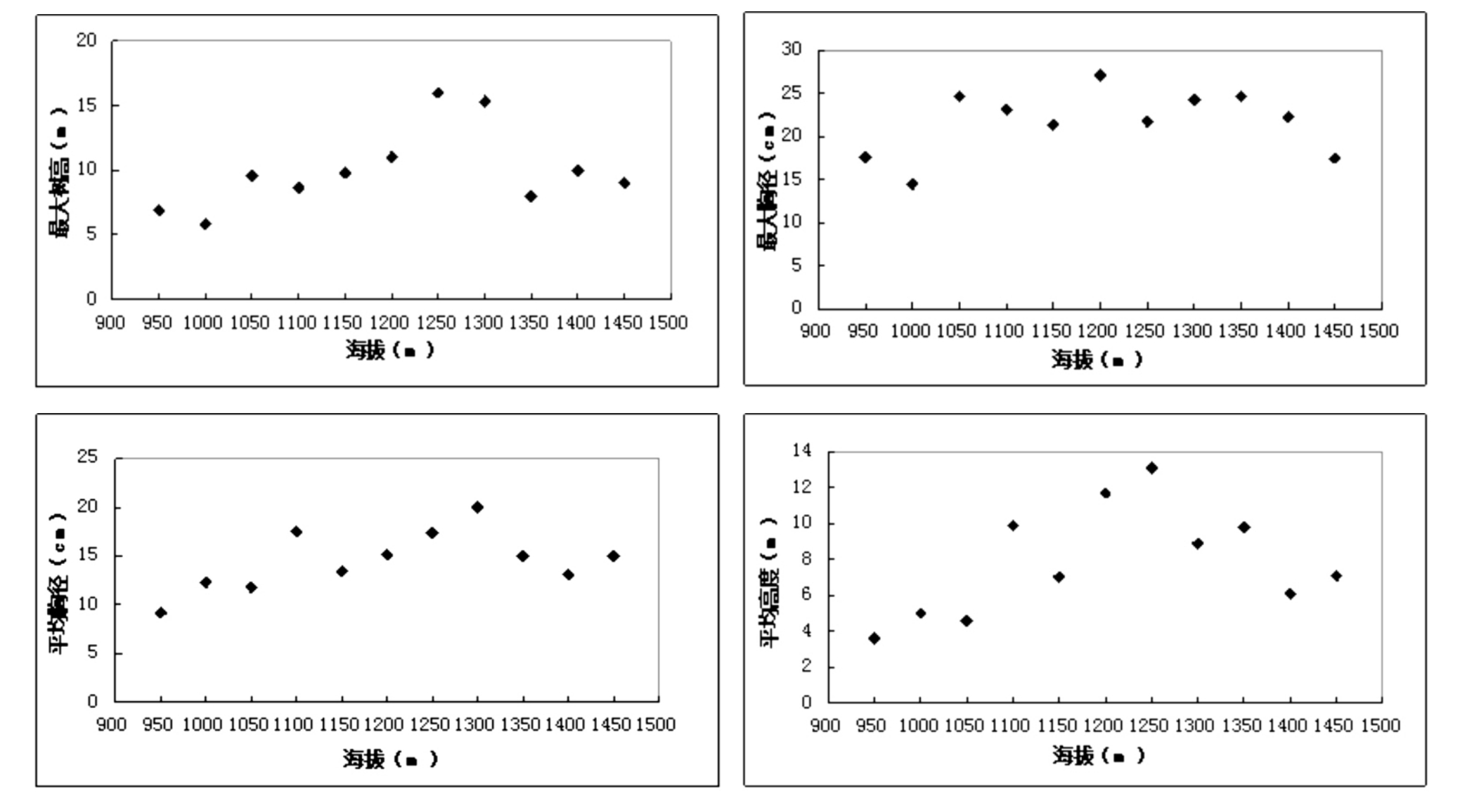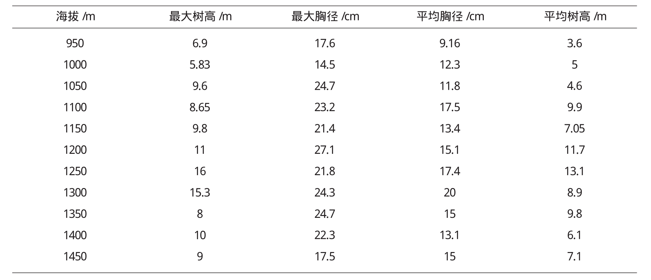 海拔/m最大树高/m最大胸径/cm平均胸径/cm平均树高/m 95010001050110011501200125013001350140014506.95.839.68.659.8111615.3810917.614.524.723.221.427.121.824.324.722.317.59.1612.311.817.513.415.117.4201513.1153.654.69.97.0511.713.18.99.86.17.1