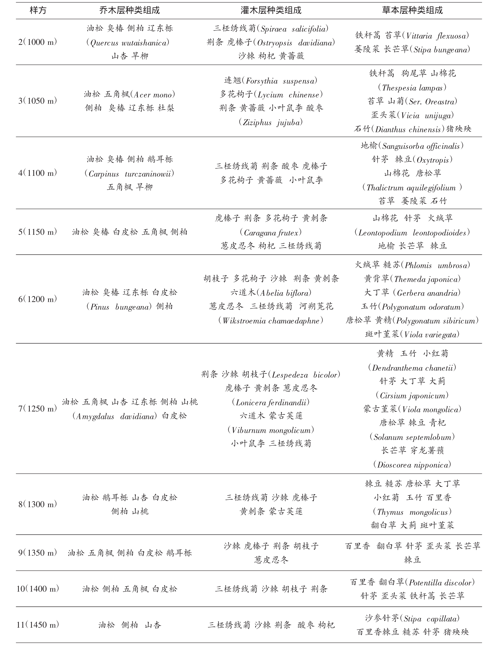 样方 乔木层种类组成 灌木层种类组成 草本层种类组成2(1000m)油松臭椿侧柏辽东栎(Quercuswutaishanica)山杏旱柳三桠绣线菊(Spiraea salicifolia)荆条 虎榛子(Ostryopsis davidiana)沙棘枸杞黄蔷薇铁杆蒿 苔草(Vittaria flexuosa)萎陵菜长芒草(Stipa bungeana)3(1050m) 油松 五角枫(Acermono)侧柏 臭椿辽东栎杜梨连翘(Forsythia suspensa)多花枸子(Lycium chinense)荆条黄蔷薇小叶鼠李酸枣(Ziziphus jujuba)铁杆蒿 狗尾草山棉花(Thespesia lampas)苔草 山菊(Ser.Oreastra)歪头菜(Vicia unijuga)石竹(Dianthus chinensis)猪殃殃4(1100m)油松臭椿侧柏鹅耳栎(Carpinus turczaninowii)五角枫旱柳三桠绣线菊荆条酸枣虎榛子多花枸子黄蔷薇 小叶鼠李地榆(Sanguisorba officinalis)针茅 棘豆(Oxytropis)山棉花 唐松草(Thalictrum aquilegifolium)苔草 萎陵菜石竹5(1150m) 油松臭椿白皮松五角枫侧柏虎榛子荆条多花枸子黄刺条(Caragana frutex)葱皮忍冬枸杞三桠绣线菊山棉花 针茅 火绒草(Leontopodium leontopodioides)地榆长芒草 棘豆6(1200m) 油松臭椿辽东栎白皮松(Pinus bungeana)侧柏胡枝子多花枸子沙棘 荆条黄刺条六道木(Abelia biflora)葱皮忍冬 三桠绣线菊 河朔荛花(Wikstroemia chamaedaphne)火绒草 糙苏(Phlomis umbrosa)黄背草(Themeda japonica)大丁草(Gerbera anandria)玉竹(Polygonatum odoratum)唐松草黄精(Polygonatum sibiricum)斑叶堇菜(Viola variegata)7(1250m)油松五角枫山杏辽东栎侧柏山桃(Amygdalus davidiana)白皮松荆条 沙棘 胡枝子(Lespedeza bicolor)虎榛子黄刺条葱皮忍冬(Lonicera ferdinandii)六道木蒙古荚蒾(Viburnum mongolicum)小叶鼠李三桠绣线菊黄精 玉竹 小红菊(Dendranthema chanetii)针茅大丁草大蓟(Cirsium japonicum)蒙古堇菜(Violamongolica)唐松草棘豆青杞(Solanum septem lobum)长芒草穿龙薯蓣(Dioscorea nipponica)8(1300m) 油松 鹅耳栎山杏白皮松侧柏山桃三桠绣线菊沙棘虎榛子黄刺条蒙古荚蒾百里香 翻白草针茅歪头菜长芒草棘豆10(1400m) 油松侧柏五角枫白皮松 三桠绣线菊沙棘胡枝子荆条 百里香翻白草(Potentilla discolor)针茅歪头菜铁杆蒿长芒草棘豆糙苏唐松草大丁草小红菊 玉竹百里香(Thymus mongolicus)翻白草大蓟斑叶堇菜9(1350m) 油松五角枫侧柏白皮松鹅耳栎 沙棘虎榛子荆条胡枝子葱皮忍冬11(1450m) 油松 侧柏 山杏 三桠绣线菊沙棘荆条 酸枣枸杞 沙参针茅(Stipa capillata)百里香棘豆糙苏针茅猪殃殃