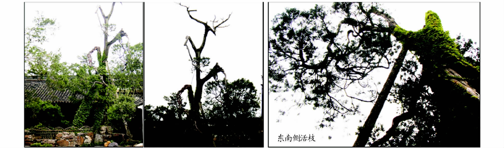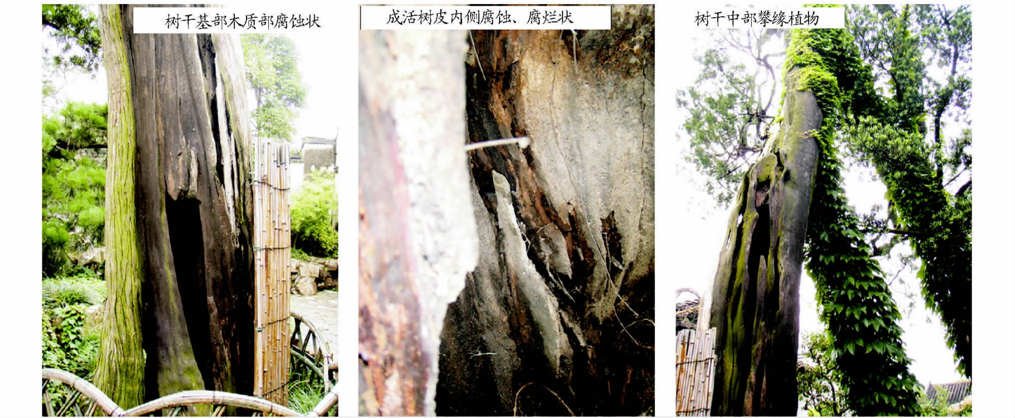 2.2 树干或主蔓 树干或主蔓生长正常的古树有3株,树种有白皮松、罗汉松、紫藤,占网师园古树总株数50.00%。树干中部木质部已腐烂、中空的古树1株,树种是木瓜,占网师园古树总株数16.67%。主蔓基部部分木质部和主蔓中段东南侧木质部已腐烂失去,残存木质仍在腐蚀,仅存半侧树皮生长良好,存活树皮宽约28 cm、厚约7 cm的古树1株,树种是紫藤,占网师园古树总株数16.67%。树干木质部大部分裸露,中、基部树干木质部形成洞穴,仅东南侧有活树皮连通根系与树冠使树体保持成活的古树1株,树种是圆柏,占网师园古树总株数16.67%。