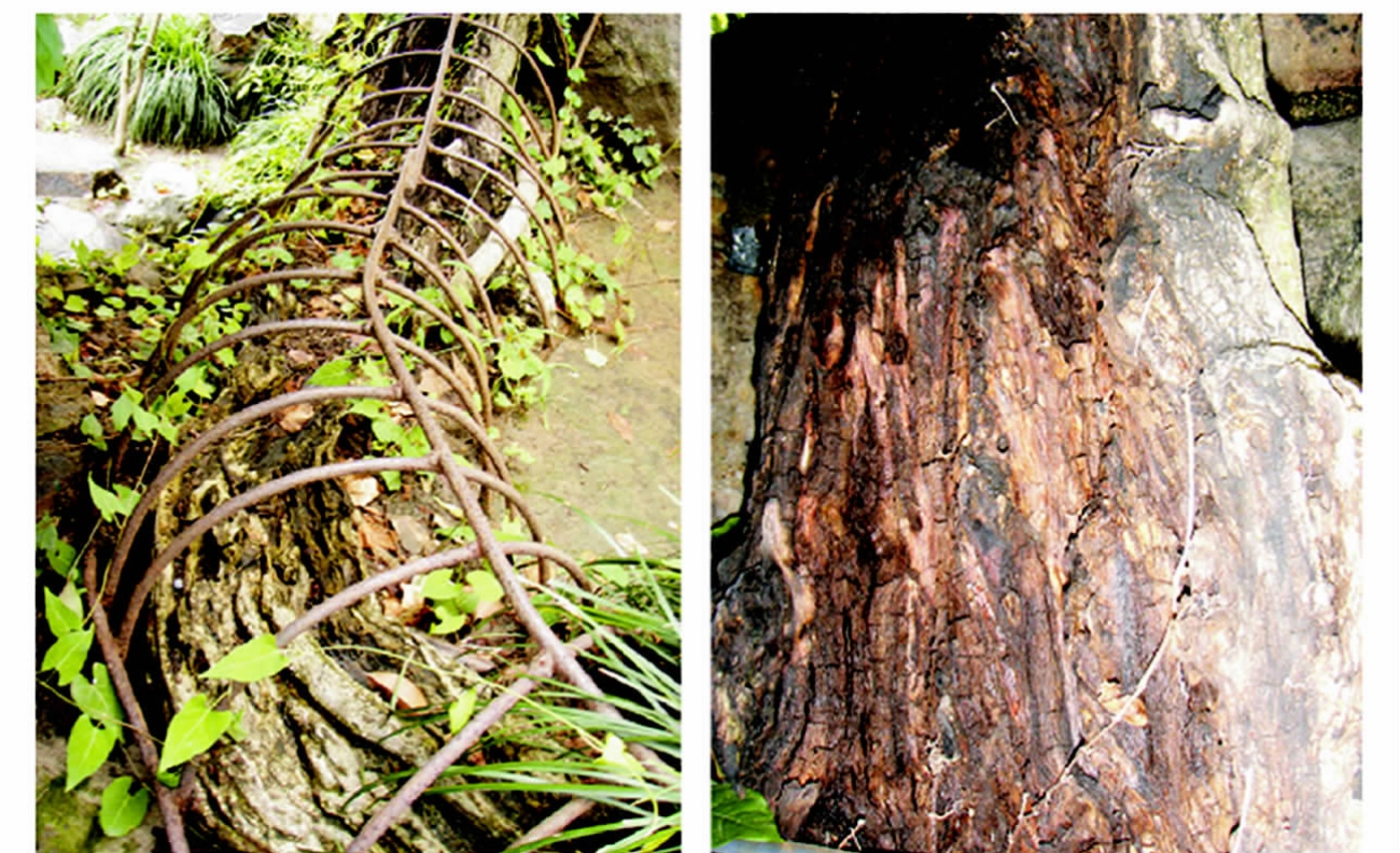 3.2.1 树体现状和病症。种植于射鸭廊南黄石假山旁的紫藤,枝叶茂密,叶色翠绿,长势正常(图4);但主蔓基部的上半部分已腐烂消失,虽安装了圆钢网罩,但仍可看出表层木质腐烂严重;中段主蔓也有近半侧木质部腐烂消失,仅存半侧树皮和木质(图5)。