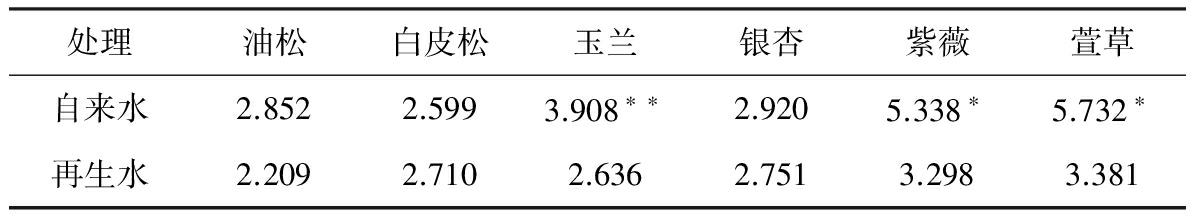 处理油松白皮松玉兰银杏紫薇萱草自来水2.8522.5993.908∗∗2.9205.338∗5.732∗再生水2.2092.7102.6362.7513.2983.381