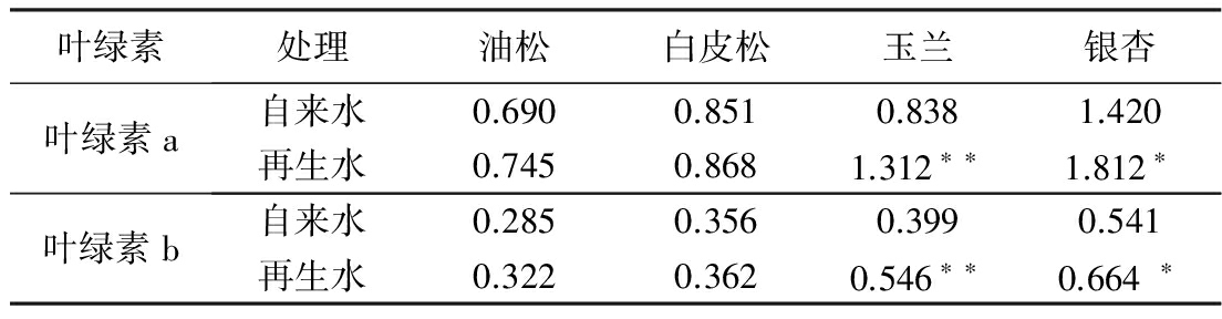 叶绿素含量也是反映植物生长状况的重要指标,不同水质灌溉下的植物叶绿素含量数据见表4,从表4中可以发现,再生水灌溉的植物中,再生水处理的叶绿素a和叶绿素b含量均高于自来水处理。其中,银杏的叶绿素a和叶绿素b含量在2种水质的灌溉下达到了5%显著水平;玉兰的叶绿素a和叶绿素b含量达到了1%显著水平。