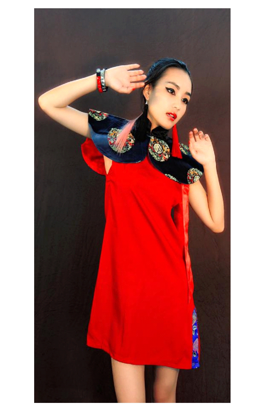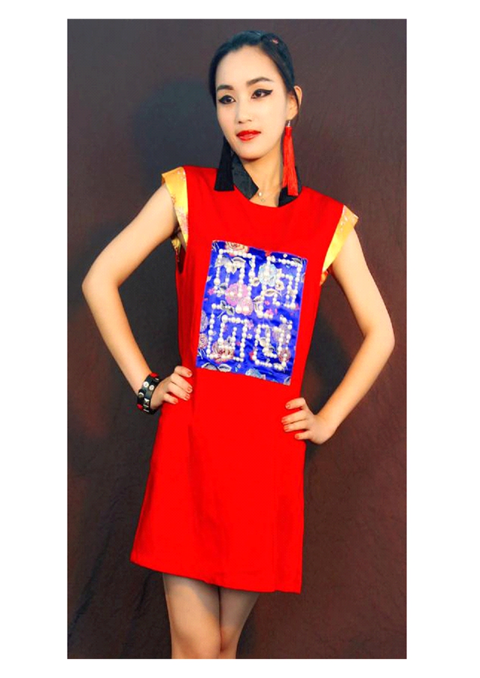 太原多福寺明代壁画中贵妇服饰图案纹样丰富多彩、装饰手法多样,从一个侧面体现了中华民族传统的审美情趣。如人物、动植物、图腾、符号等纹样经过服装设计师从传统纹样中挖掘其深厚的资源,从民间艺术中发掘其优良的元素,经过重组、拼接、提炼运用到现代服装设计中,通过贴绣、印染、刺绣、手绘、编织等工艺手法,把这些图案装饰在服饰及配件的装饰处理上,使其具有较强生命传承力量,取得更好的艺术效果。在现代服装设计中,设计师喜欢借饱含寓意的传统图案来装饰在衣片的前胸、袖口、襟边和下摆等各个部位。作品《日月》则根据太原多福寺明代壁画中贵妇服饰的图案纹样予以提炼重组,运用简化、夸张、连续、群和、均匀、渐变,有序、无序等现代表现手法处理并运用传统纹样。运用团花图案在肩、袖、群、胸等部位予以装饰,传达了清新高雅的服饰风格,在图案装饰时应符合时代的审美和设计观念,在体现民族情怀的同时,以符合时代要求的方式展现于服装艺术创作中。品牌服装与一般服装的区别是其内涵多,品牌总体形象相对完整,并有一定的市场认知度和商业信誉。[5]例如:伊夫·圣洛朗在2004~2005年秋冬服装发布会上,又以奢华中国风作为主题,采用仿旗袍式立领的款式,合体的裙身,采用鲜艳的中国红绸缎和丝制面料,运用蝴蝶盘扣、龙纹、中国图腾、云纹图案加以装饰,利用提花、织锦、刺绣等编织技巧,展现出极度奢华靓丽的中国风情。