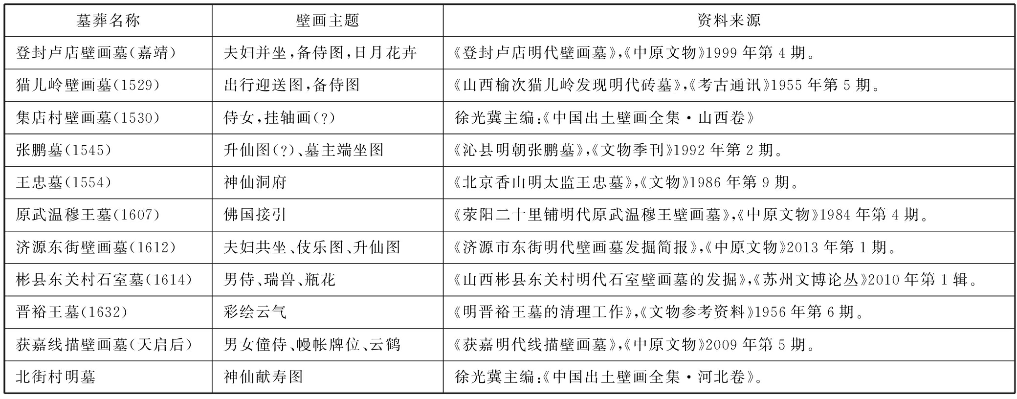 墓葬名称壁画主题资料来源登封卢店壁画墓(嘉靖)夫妇并坐,备侍图,日月花卉《登封卢店明代壁画墓》,《中原文物》1999年第4期。猫儿岭壁画墓(1529)出行迎送图,备侍图《山西榆次猫儿岭发现明代砖墓》,《考古通讯》1955年第5期。集店村壁画墓(1530)侍女,挂轴画(?)徐光冀主编:《中国出土壁画全集·山西卷》张鹏墓(1545)升仙图(?)、墓主端坐图《沁县明朝张鹏墓》,《文物季刊》1992年第2期。王忠墓(1554)神仙洞府《北京香山明太监王忠墓》,《文物》1986年第9期。原武温穆王墓(1607)佛国接引《荥阳二十里铺明代原武温穆王壁画墓》,《中原文物》1984年第4期。济源东街壁画墓(1612)夫妇共坐、伎乐图、升仙图《济源市东街明代壁画墓发掘简报》,《中原文物》2013年第1期。彬县东关村石室墓(1614)男侍、瑞兽、瓶花《山西彬县东关村明代石室壁画墓的发掘》,《苏州文博论丛》2010年第1辑。晋裕王墓(1632)彩绘云气《明晋裕王墓的清理工作》,《文物参考资料》1956年第6期。获嘉线描壁画墓(天启后)男女僮侍、幔帐牌位、云鹤《获嘉明代线描壁画墓》,《中原文物》2009年第5期。北街村明墓神仙献寿图徐光冀主编:《中国出土壁画全集·河北卷》。