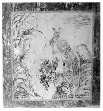 凤衔灵芝壁画的构图属于独幅画构图,充分表现出我们民族求整尚全的传统心理。单从凤凰形象、壁画中下方的模糊花草纹样还有壁画右下方山石纹样来讲,此构图为三角形构图,且为正三角形构图,这三种形象所构成的三角形构图是一种稳定的构图,使整个画面感觉更加稳定。