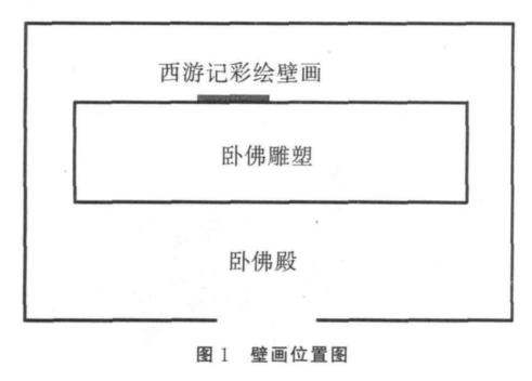 卧佛殿卧佛背后一面墙壁绘有西游记壁画,长约4.4、宽约2.95m,面积约13m2(图1),描绘了多个取经故事。