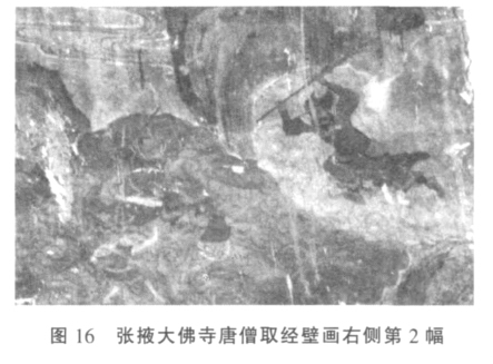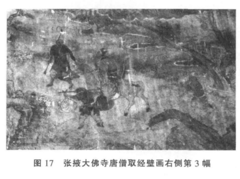 2006年,蔡铁鹰先生发表《张掖大佛寺取经壁画应是〈西游记〉的衍生物》[5]。作者通过与东千佛洞、榆林窟等取经壁画在绘制精细程度的比较,以及据“恨逐美猴王”情节的出现时间推断大佛寺取经壁画“只能是清代作品”。文中提到壁画内容有大闹天宫、活人参果树、恨逐美猴王、大战火云洞、路阻火焰山、四人西行等。