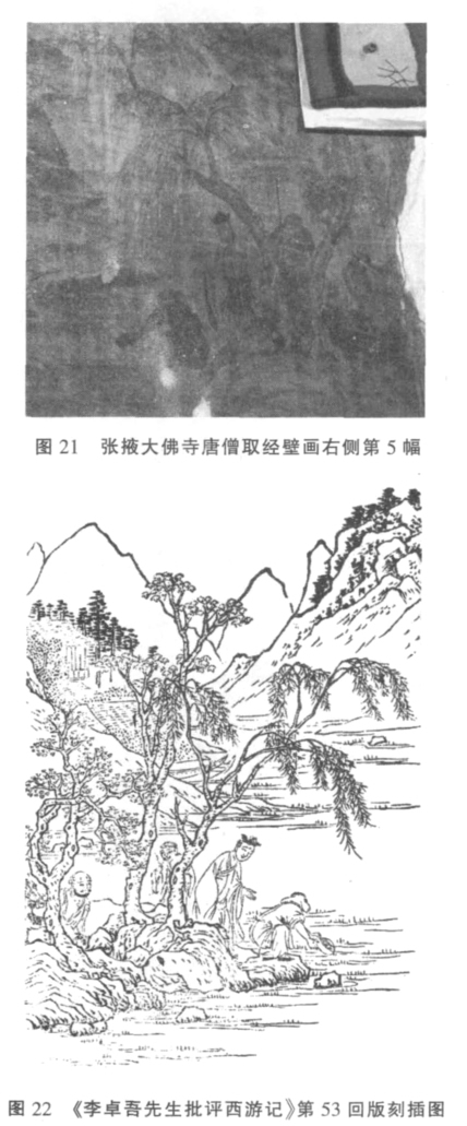 第5幅绘八戒蹲在河边正用容器从河里舀水,唐僧在他身后,右手略抬起,似乎要伸手接过八戒手中的容器,后面悟空与沙僧立于三藏身后。四人中间绘有两株树(图21、22)。《李卓吾先生批评西游记》中第53回 《禅主吞餐怀鬼孕黄婆运水解邪胎》的版刻插图与其极为近似,只是人物、景物皆为镜像模样,想必是画工因构图的需要而调整。学者们对该幅壁画内容的看法也较为一致,即子母河饮水的故事。