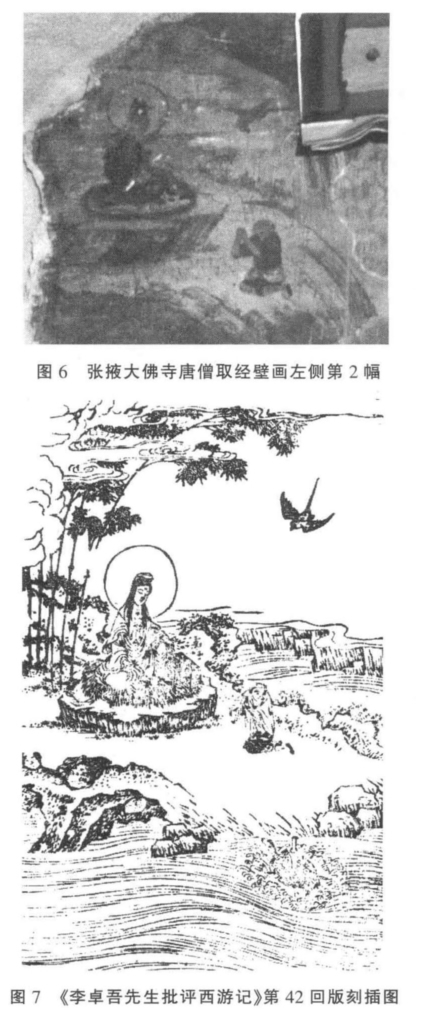 大佛寺取经壁画取材于李评本《西游记》刻本插图说,前提是壁画要和李评本《西游记》版刻插图基本一致,通过上面的比较已一目了然,不再繁述。其次是证明大佛寺取经壁画是以《李卓吾先生批评西游记》版刻插图为蓝本,笔者认为有以下几方面: