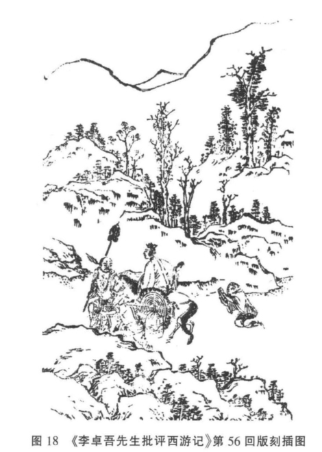 依据壁画中人物及其动态,大致可知其内容为唐僧恨逐美猴王,但《西游记》中有两篇写唐僧驱逐悟空的章回,其一为第27回《尸魔三戏唐三藏圣僧恨逐美猴王》,其二为第56回《神狂诛草寇道昧放心猿》,仅据《西游记》的文字不易对其确认。借助《李卓吾先生批评西游记》第56回刻本插图,知此幅壁画内容应归为第二次放逐心猿的情节。两图人物、动作、环境安排别无二致。刻本第27回插图形象虽与此接近,但区别在于唐僧是左手后摆做驱逐状而非右手,孙悟空不在地上跪倒而是已腾云在天,双手作揖惜别等。