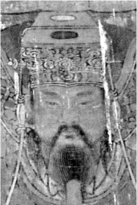 第一,帝王。东壁三位主像都头戴十二旒冠冕,显示出他们与众不同的帝王身份,三人都身穿盘领右衽宽袖长袍朝服,袖宽以显示其尊贵。西壁拜坛之上东岳头戴明代皇帝戴的乌纱折上巾,显示出其帝王身份,坐于两侧的后稷、伯益头戴王冠,区别于坛下之文武官员。画者为了突出东西两壁这六位主像的地位,将他们的身体比例绘制得大约是画面文武群臣的两倍,加上又以仰视的视角表现,更显出其地位的尊贵。值得注意的还有画者将东、西两壁后稷、伯益绘制为正侧面坐姿,这既有别于一般寺观壁中主像为一字排开的正面坐姿的绘制方式,又符合现实场景。另外,西壁三位主像放松、自然的坐姿,尤其是东岳手扶坐椅身体微倾,与东壁三位主像手棒笏板正襟危坐的姿态,形成鲜明对比,这一细节体现出了东壁大典大礼与西壁群臣朝拜气氛之不同。(图1-图4)①本文插图均由笔者实地拍摄。