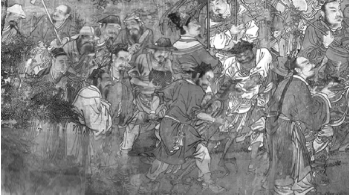 第二、官吏。画面中的官吏按身份和地位的高低排列有序、彬彬有礼,神态恭敬、虔诚,有的着圆领长袍、有的着右衽长袍、有的项间饰有方形曲领。官吏头戴梁冠、展翅乌纱、东坡巾、软翅幞头等。他们或专注、或交谈、或拱手、或捧笏板、或拿宗卷、或驻立、或行进,姿态各异。