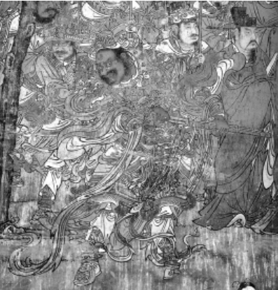第六、神仙鬼卒。东岳稷益庙壁画中出现的神仙鬼卒形象,只是在描绘面孔时用了比较夸张的手法。他们大都面目狰狞、虬发飞舞,有牛头马面、有龙首人身,有青面、红面、黄面,有的甚至面无血色,与常人形成鲜明的对比,但他们的体态、装束与常人并无二异,他们或交谈、或顾盼、或行进,在画者的笔下已经完全被人格化了。(见图9)