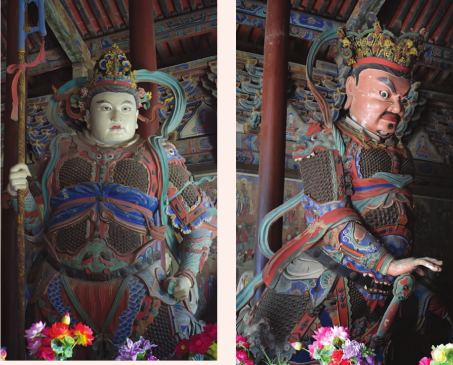 释迦佛座前立塑伽叶(左侧长者,半披式佛衣)、阿难(右侧少者,钩纽式佛衣)两胁侍弟子,每尊高约3.5米。其形象一老一少,以老喻示持重,表示苦行;以少表示敏捷,表示记忆。二者合起来喻示佛教修行中的持戒(苦行)与诵经(多闻)两大法门。从空间布局看,释迦佛与迦叶、阿难构成一个小三角的形状,与佛台两侧二护法天王构成一个大三角的形状,整体呈现出类似金字塔般的稳定性。护法天王身着全副盔甲,高4.5米,身姿前倾,右护法怒目圆睁,右手执剑,左护法神情刚毅,右手持戟。二天王莲花须弥座壼门正中浮雕卧狮,两侧为金刚力士,极富动感(图六)。