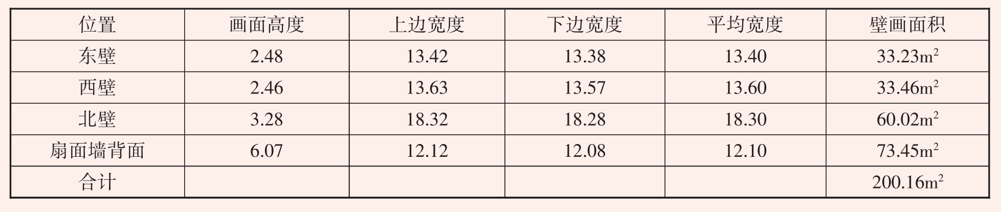 位置 画面高度 上边宽度 下边宽度 平均宽度 壁画面积东壁 2.48 13.42 13.38 13.40 33.23m2西壁 2.46 13.63 13.57 13.60 33.46m2北壁 3.28 18.32 18.28 18.30 60.02m2扇面墙背面 6.07 12.12 12.08 12.10 73.45m2合计 200.16m2
