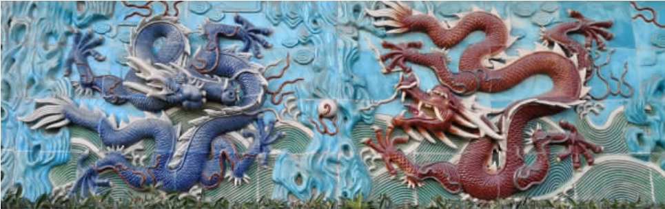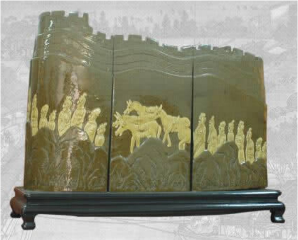 均陶堆贴花器皿表面的装饰构图样式大概有几种分类:(1)以满花装饰为主;(2)传统的民族吉祥图案;(3)中国画构图;(4)大拇指泥画民艺派。 不同时代的装饰图案各有风格,纵观宜兴均陶堆贴花器皿的演变史,我们不难发现其风格受时代背景影响很大,明清时期就出现的传统均陶堆贴花器皿中的神话宗教题材、祥瑞图案;建国后出现了特有的政治氛围的画面题材装饰内容,再到现在堆贴花与书法相结合的具有文人气息的画面效果,都是宜兴均陶对贴花器皿与人们当今时代生活的需求紧密相连的佐证,它们都清楚地记录下了宜兴均陶工艺发展与时代生活进步节奏一致的历史。均陶堆贴花技法讲究扎实的基本功,即堆贴花的指法。拇指堆贴花有捏法、搓法、捻法、揿法、摊法、撕法、扰法、擦法、托法、堆法、贴法等十几种指法,主要的是摊法、撕法、扰法、拕法四大指法,传统的均陶堆贴花技法虽然具有一定薄浮雕感,造型生动富有装饰意趣,但是整体画面还是较为平面化,起伏感体积感不强 (见图4)。当代均陶国大师李守才独创了 “半浮雕”、“立体浮雕”堆贴法,将雕塑理念融入堆贴技艺,使得堆贴花的效果更加生动有趣,夺人眼球,无锡锡惠公园的浮堆九龙壁就是其代表作,被誉为“中国四大九龙壁之一”(见图5)。