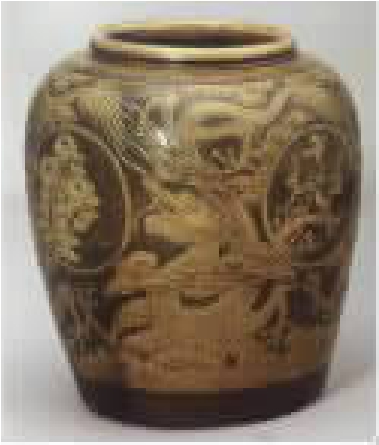 随着时代的发展,科学技术日新月异地更替,民间艺术的表现形式也在随着人们的需要不断创新,体现了民间艺术文化的传承与发展。宜兴均陶堆贴花制作技艺是历代均陶堆贴花艺人为我们创造的精神文明的象征,传承学习、创新发扬是我们爱好者和从业者的使命。宜兴均陶堆贴花器皿发展到今天,必然为了适应不同时期的人们的需求与审美在很多方面做出了改变,下面就以当代两位具有业界楷模地位的均陶艺人方卫明和李守才的几个作品为例,从泥釉材料、外观造型、使用功能三个方面来谈谈近现代的宜兴均陶堆贴花艺术创新发展情况。