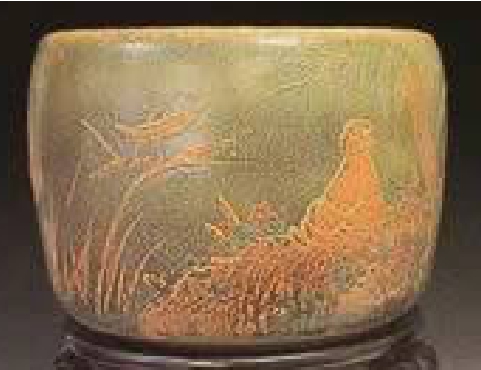 【摘要】宜兴均陶器的大拇指堆贴花技艺和温润敦厚的均釉与宜兴紫砂制作技艺并称“陶都三宝”。均陶堆花技艺是以手指为工具,用呈色不同的原料配制出各种色泥,在粗泥坯体表面用色泥堆贴组成既具有黏土意味,又具有浮雕效果的艺术品。坯体完全干燥后,施以透明釉或者半透明釉,经过1 200℃以上高温一次烧成。画面清晰、层次分明,构图疏简有致,釉色绚丽多彩,具有很高的艺术欣赏价值。均陶堆贴花器皿的造型从早前的日常用具发展起来,有碗、杯、水壶、坛、缸、盆等。明代老缸在造型上以大缸为例子,主要用途有存水、养鱼、种荷花等,气度雄伟、古朴稳重。清代、民国在明代的基础上品种更多了,有花盆、花插、钵盂、陶凳等,工艺日益成熟。发展到现代,品种已经十分多元化,造型细而精,从日用品、工艺品到艺术品,均有均陶壁画等现代景观陶艺,不论是造型设计还是使用功能都有了符合时代审美和需求的发展。