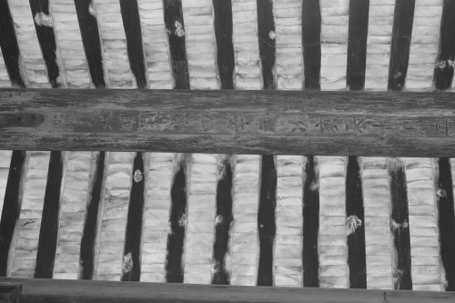梁架结构也是辨别传统古建年代的重要依据,但是由于中国传统古建的梁架多为木质,极易腐蚀、蛀毁,故年代久远的梁架很难保存至今。北滘桃村报功祠后堂保留有部分明式梁架,是顺德祠堂中不可多得的断代标本(见图7),其正梁上甚至刻有“大明天顺四年岁次庚辰十月二十九辛未日合乡重建”的字样(见图 8)。[3]