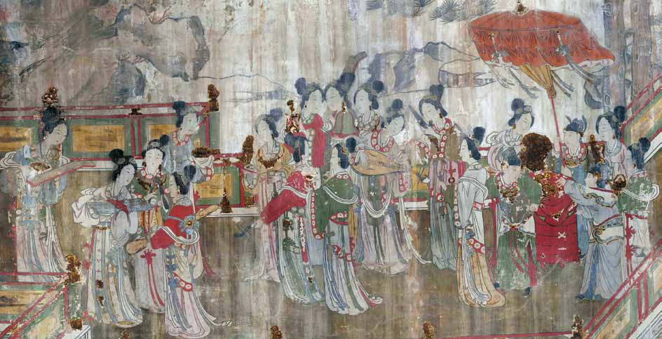 太原金胜村6号唐墓壁画,上部绘日月星辰,下部绘青龙、白虎、朱雀、玄武“四神”。此外,还画有十二个人物,或活动于树下,或行走于竹林,老者苍健,仕女丰腴,神态装束与中原唐代墓俑极为相似。