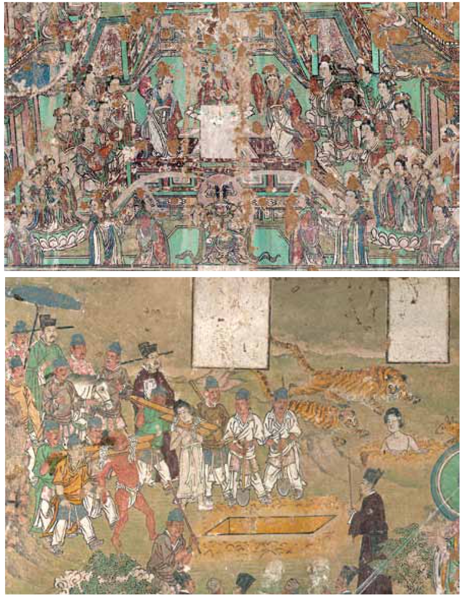 此外,沁源作平村金墓中绘二十四孝、平陆平高村元墓中画世俗生活、晋祠南侧元墓中的水面泛舟图、新绛三林镇元墓中的山石梅花喜鹊图、太原小井峪元墓中的乐队奏乐图,以及榆次猫儿岭明墓中的墓主人出行图等,都是当时社会生活的再现,是人们研究当时丧葬制度、绘画传统、以及各种服饰器皿、生产生活方式的可考资料。又墓室壁画埋于地下,不可能经后人重装或补绘,时代风格明显,史料确切,在这方面比寺观壁画尤显珍贵。