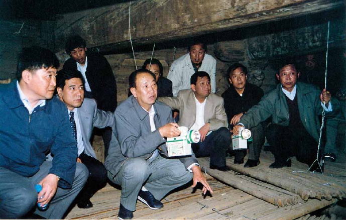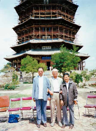 ▲ 2001年,柴泽俊、日本玲木嘉吉、罗哲文现场研究木塔保护方案
